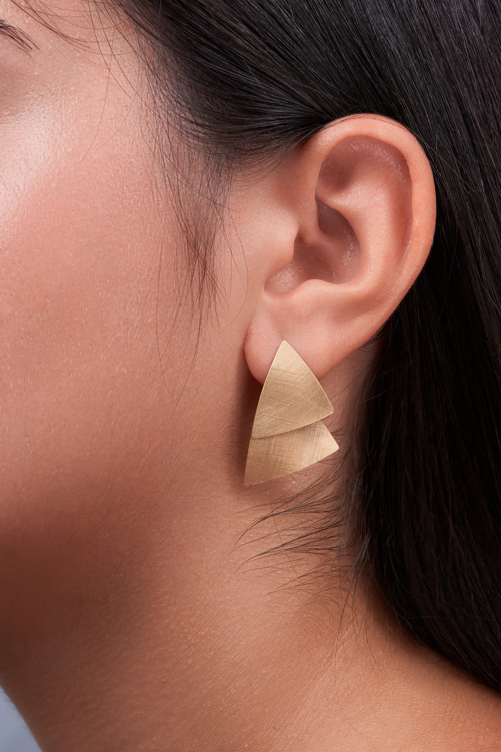 Pendientes de diseño moderno y elegante, compuestos por dos triángulos dorados mate de diferentes tamaños, creando un efecto geométrico sofisticado y contemporáneo. La pieza superior es un triángulo más pequeño, mientras que la inferior es un triángulo de mayor tamaño, ambos con un acabado mate que aporta textura y estilo refinado.