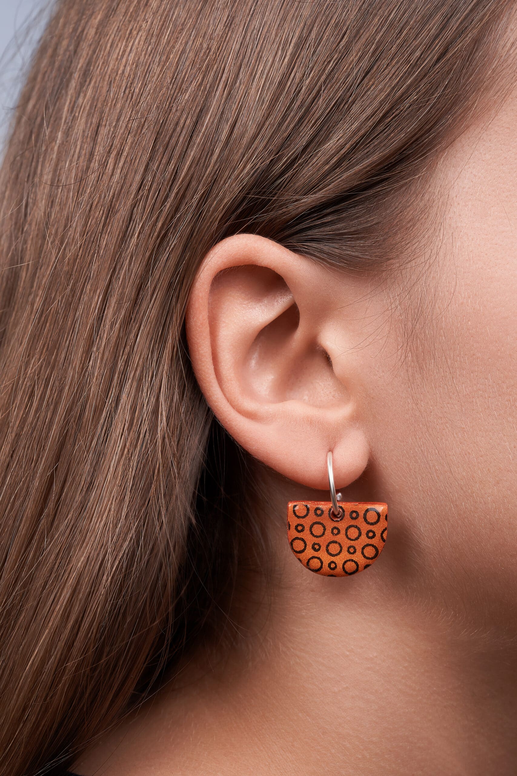 Pendientes de diseño atrevido y contemporáneo, trabajados en arcilla polimérica de color naranja decorada con círculos negros que aportan un toque moderno y llamativo. La forma principal es un medio círculo, creando una silueta original y versátil que destaca por su estilo único. El cierre es un aro plateado en forma de círculo, con una pequeña bola de tope que asegura que el pendiente quede fijo en el agujero sin riesgo de soltarse, ofreciendo comodidad y seguridad durante su uso.