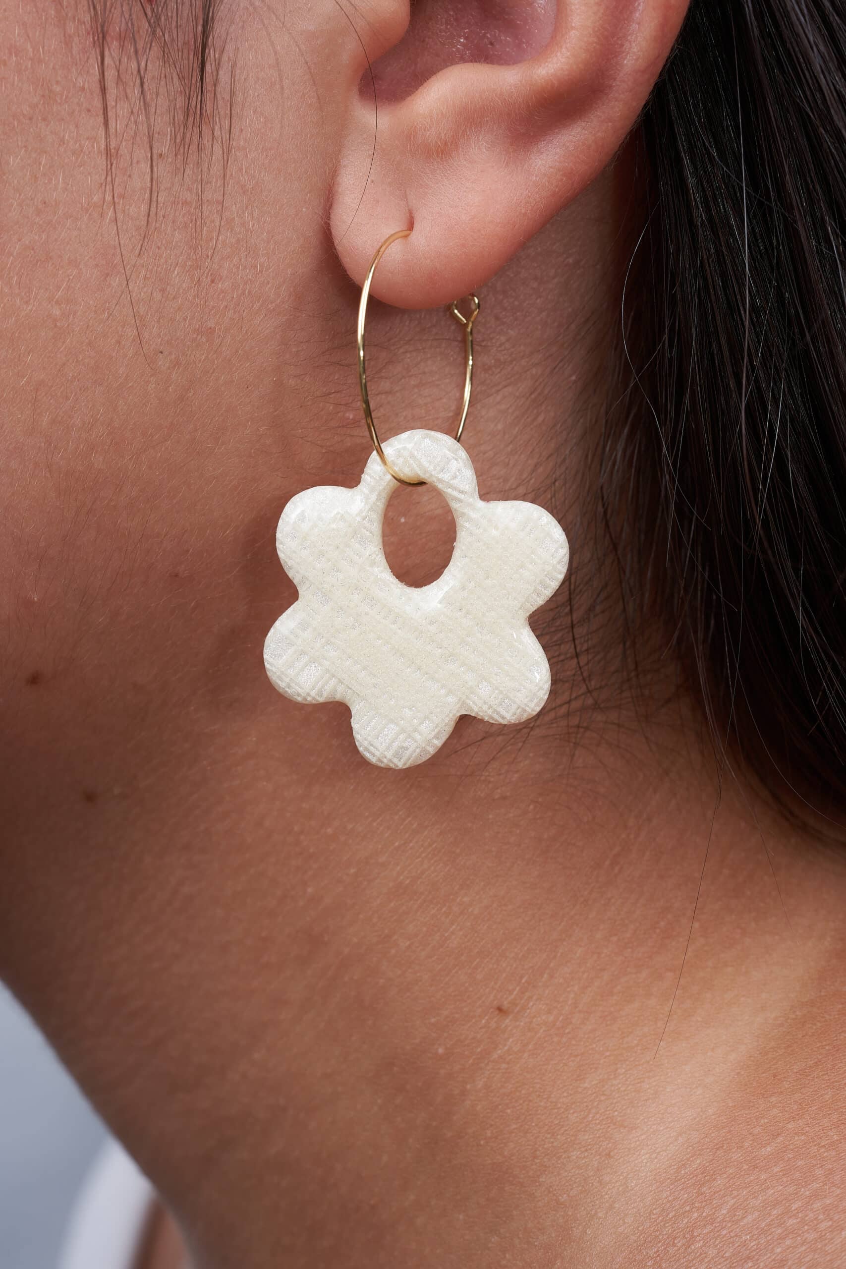 Pendientes de aro con colgante en forma de flor, elaborados a mano en arcilla polimérica de color marfil con textura grabada de líneas cruzadas. Su diseño combina un aro fino dorado con una flor de acabado mate, creando un estilo fresco y versátil para el día a día.