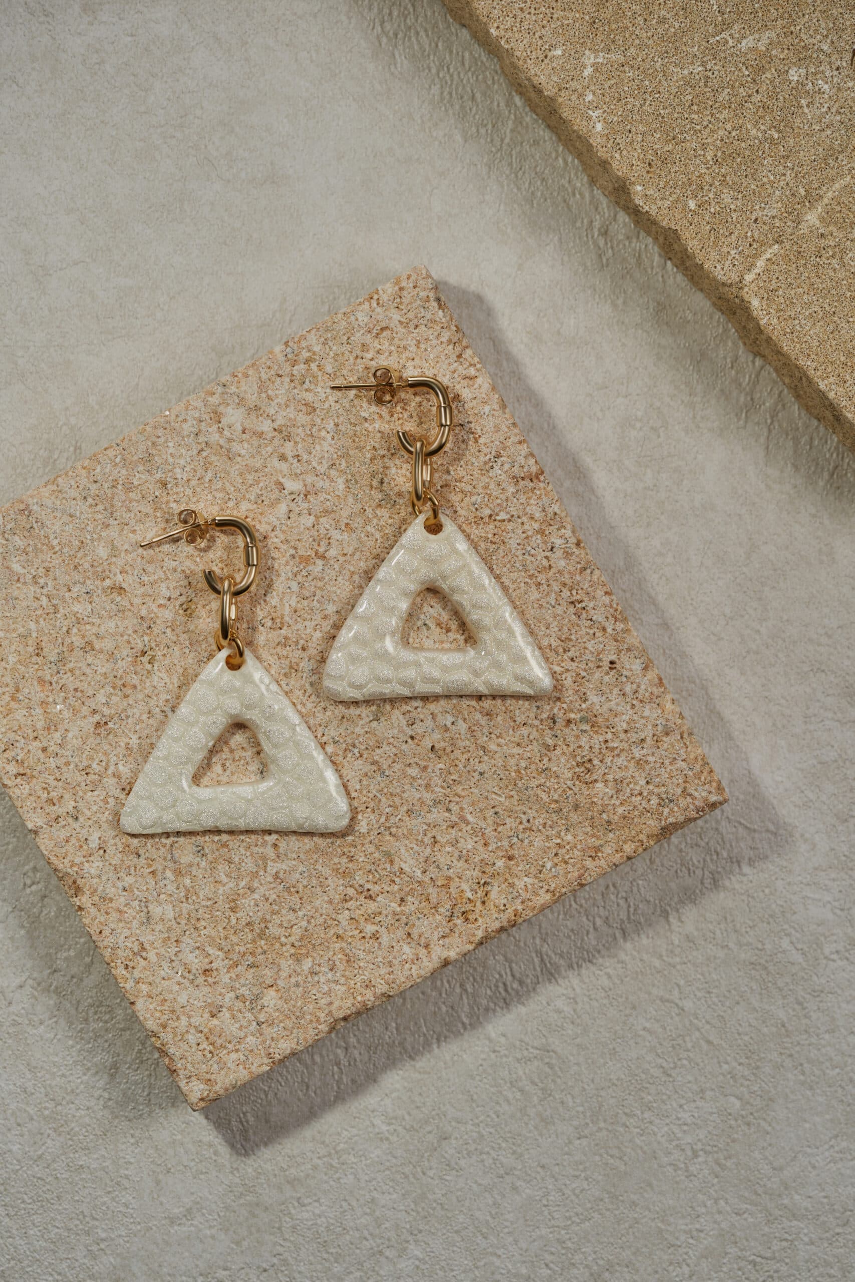 Pendientes de diseño geométrico y elegante, con forma triangular en color blanco, decorados con texturas redondas que aportan un toque táctil y visualmente interesante. La pieza cuenta con un hueco central que añade ligereza y modernidad al diseño. El cierre consta de dos partes: una argolla redonda dorada que une el triángulo con el gancho, y un gancho de latón bañado en oro que garantiza una sujeción segura y cómoda, completando el estilo sofisticado del pendiente.