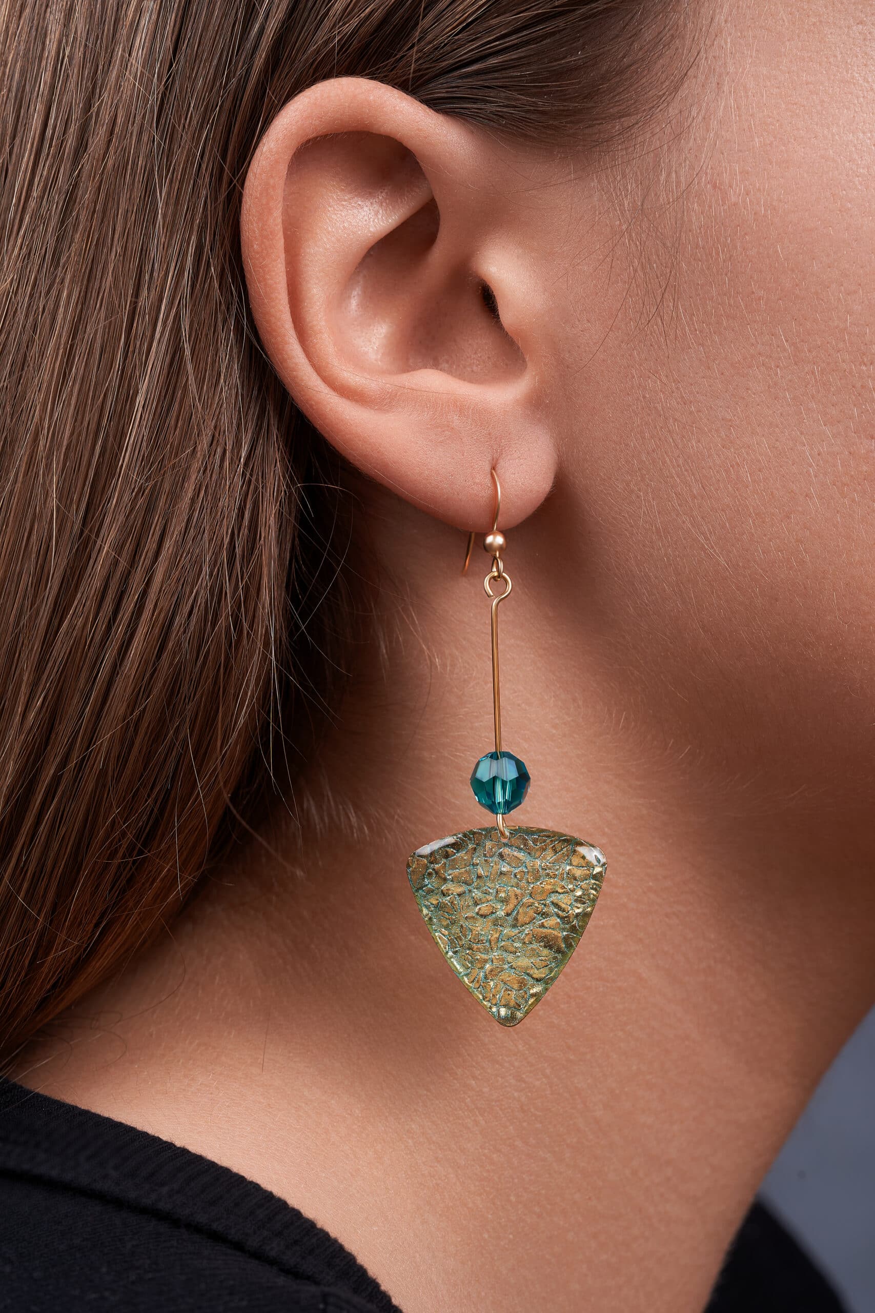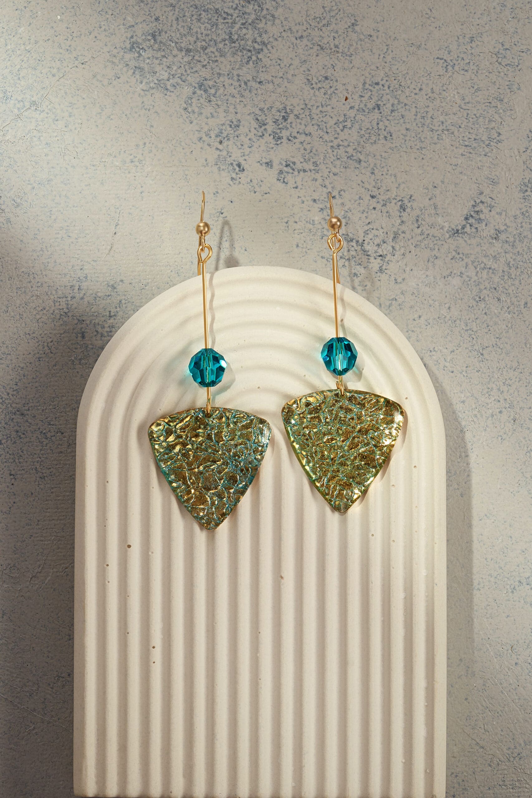 Pendientes de diseño elegante y contemporáneo, compuestos por tres piezas que combinan texturas y colores con gran estilo. La pieza inferior es un triángulo invertido de latón bañado en oro con un acabado arrugado, recubierto parcialmente con resina azul que aporta brillo y profundidad. En la parte superior del triángulo hay un pequeño agujero por donde pasa un hilo delgado de latón bañado en oro, que conecta con una bola azul de plástico, añadiendo un detalle colorido y ligero. En la parte superior del pendiente se encuentra el gancho de latón bañado en oro, que completa el diseño con una sujeción segura y cómoda.