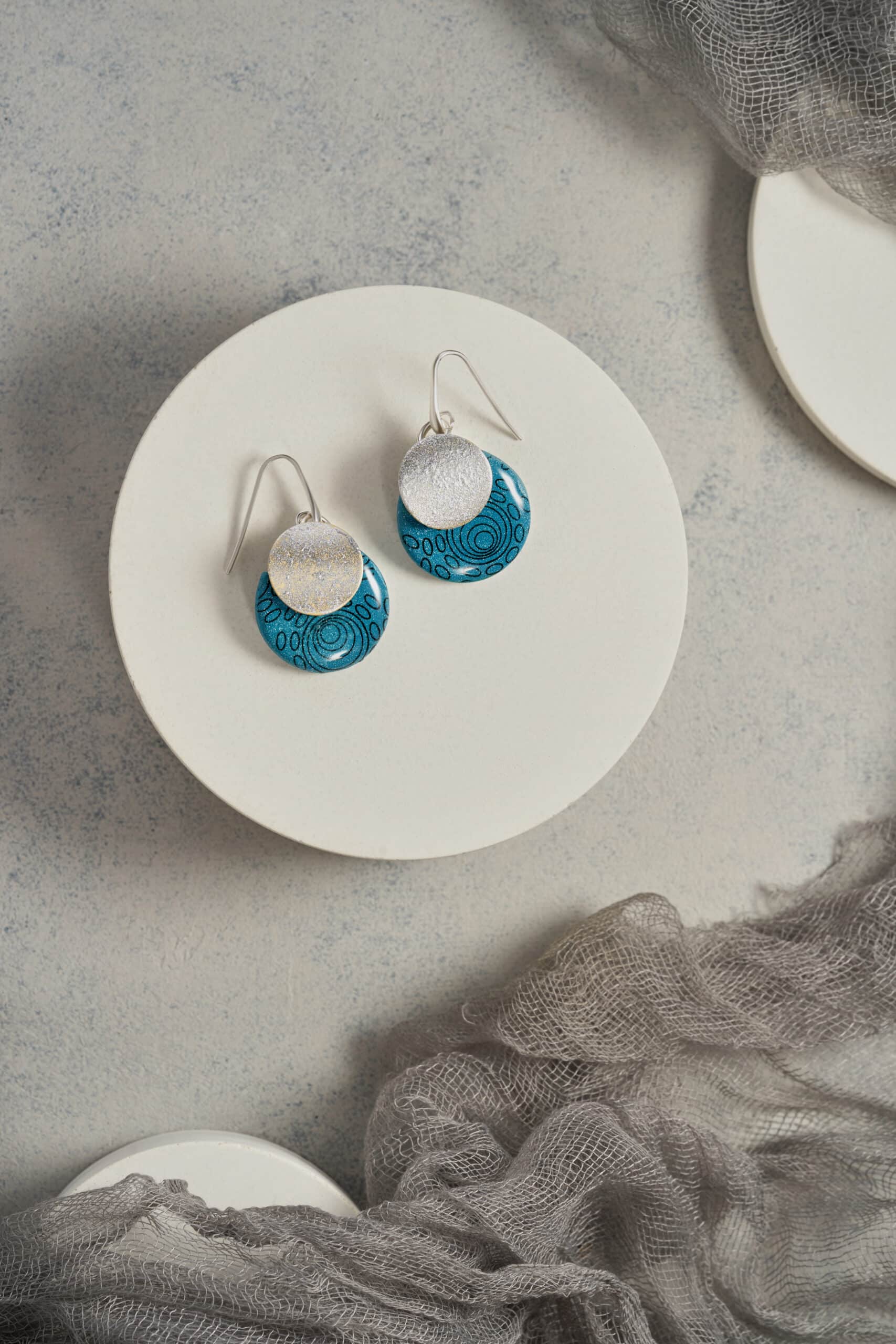 Pendientes de diseño moderno y sofisticado, compuestos por dos piezas que combinan color y textura con gran estilo. La pieza trasera es un círculo de arcilla polimérica azul decorado con círculos negros de diferentes tamaños, creando un estampado dinámico y llamativo. La pieza delantera es una chapa de latón dorado con pintura metálica plateada, que aporta un contraste elegante y un acabado brillante. El gancho es de plata con forma similar a un anzuelo, ofreciendo una sujeción cómoda y segura que completa el diseño contemporáneo.