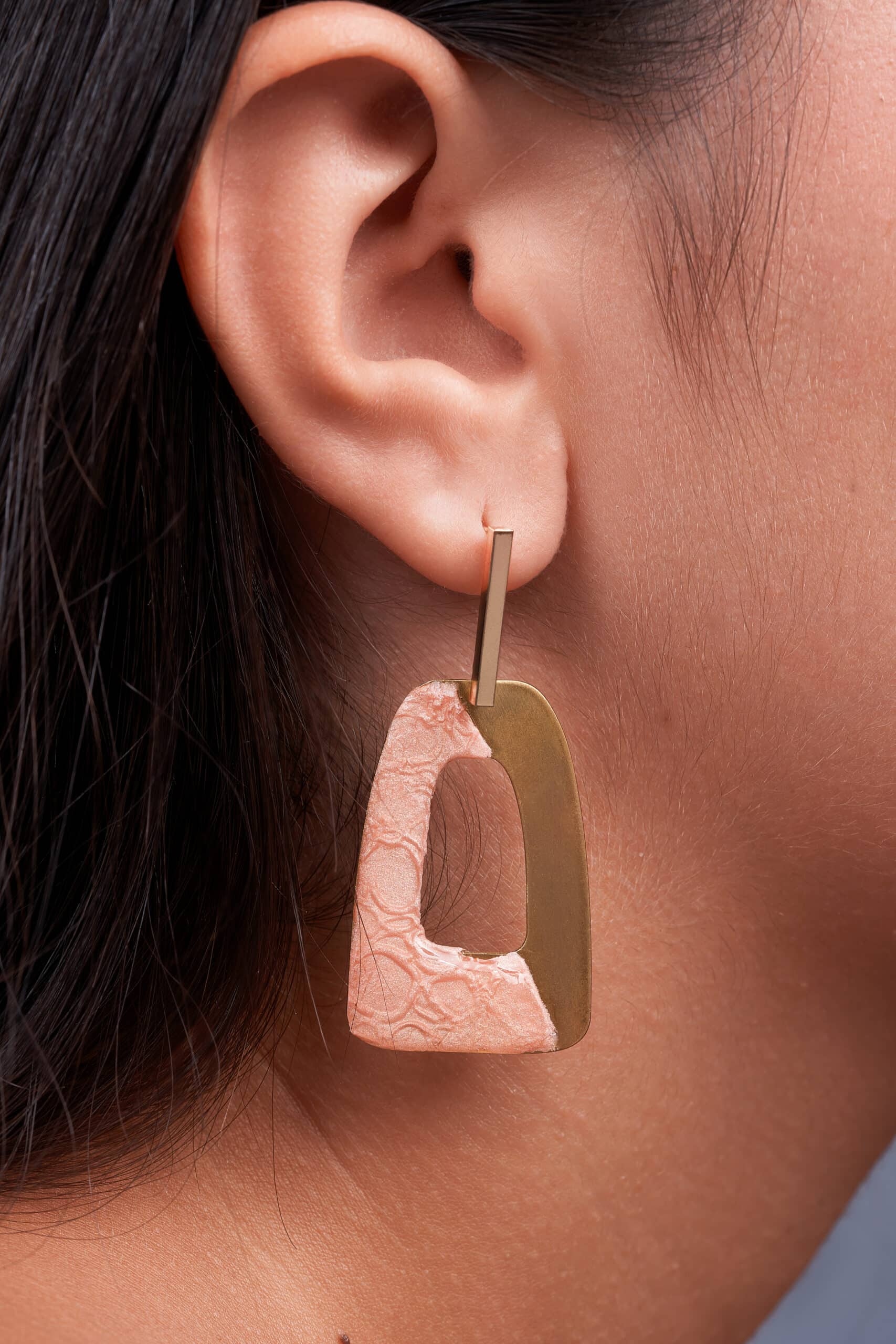 Pendientes de diseño geométrico minimalista, que combinan la elegancia del latón pulido con la calidez de la arcilla polimérica rosa. La pieza se divide en dos mitades: el lateral izquierdo es de latón pulido y el lateral derecho está trabajado en arcilla polimérica rosa con relieves suaves, recubierta con una capa de resina transparente que aporta brillo, protección y un acabado vitrificado. Cuentan con un cierre de pasador rectangular que completa su estilo contemporáneo.