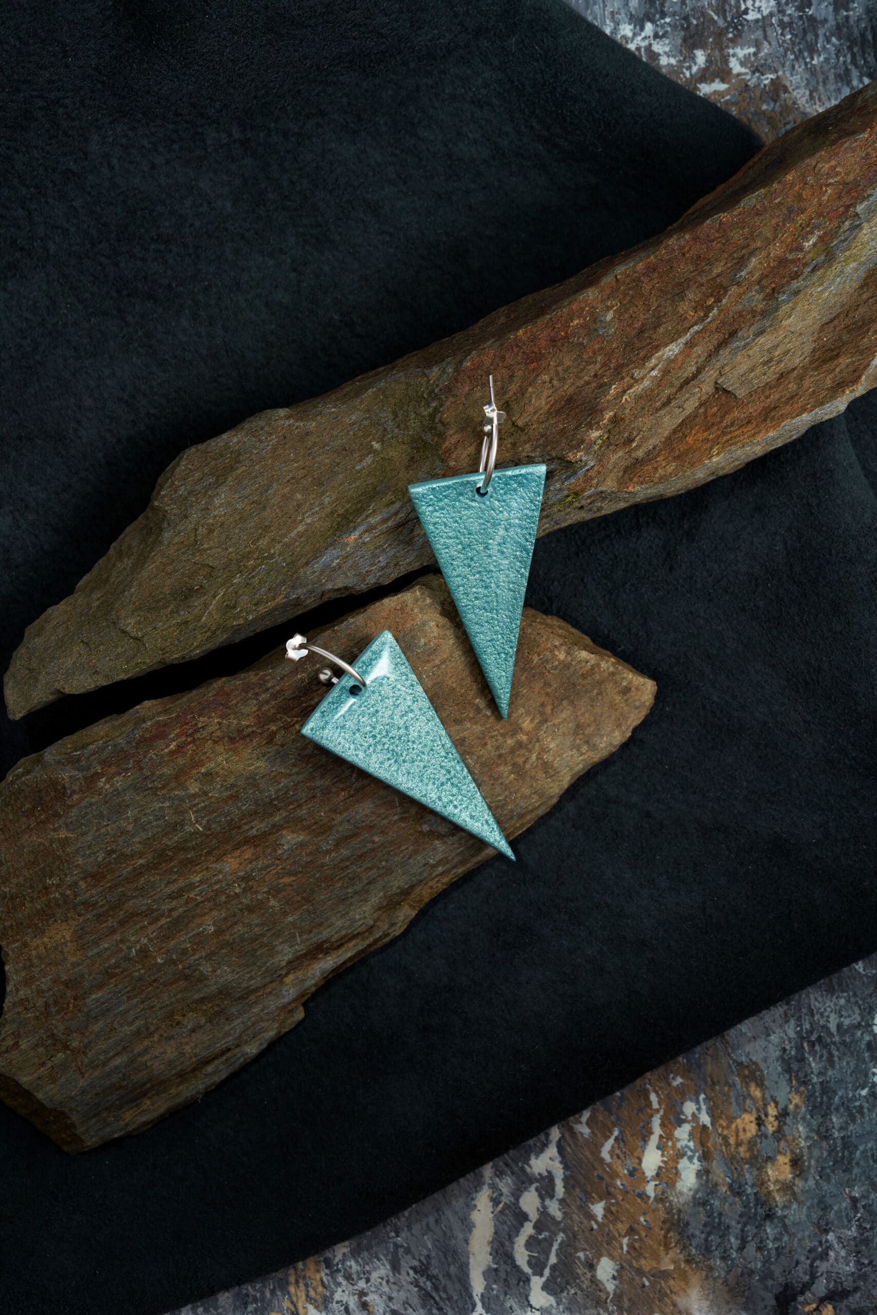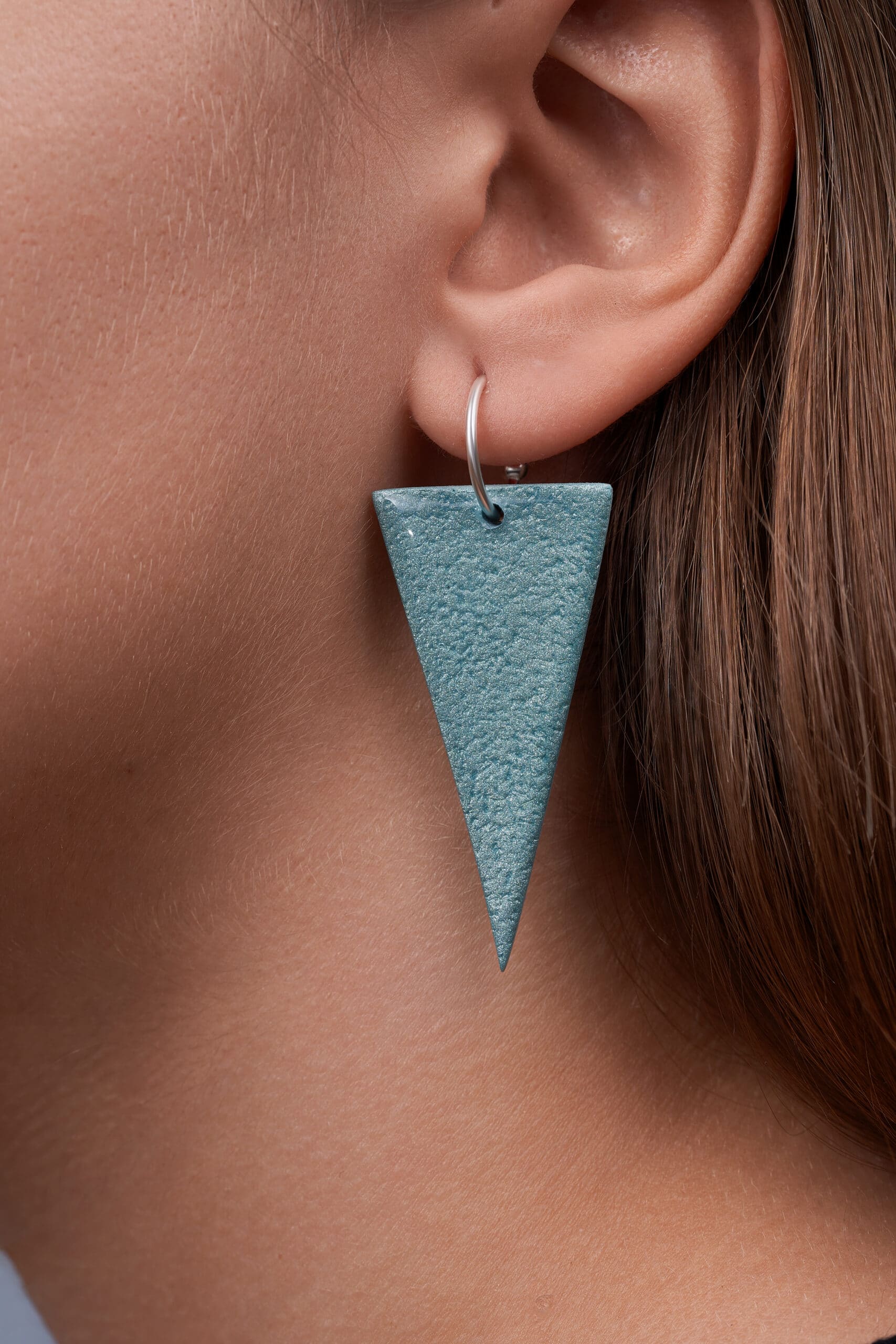 Pendientes de diseño minimalista y fresco, elaborados en arcilla polimérica con forma de triángulo. Su color azul vibrante se combina con un estampado texturizado que recuerda a la apariencia de la arena, aportando un acabado natural y único. El gancho es de plata, ofreciendo un toque elegante y asegurando una sujeción cómoda y segura para uso diario.