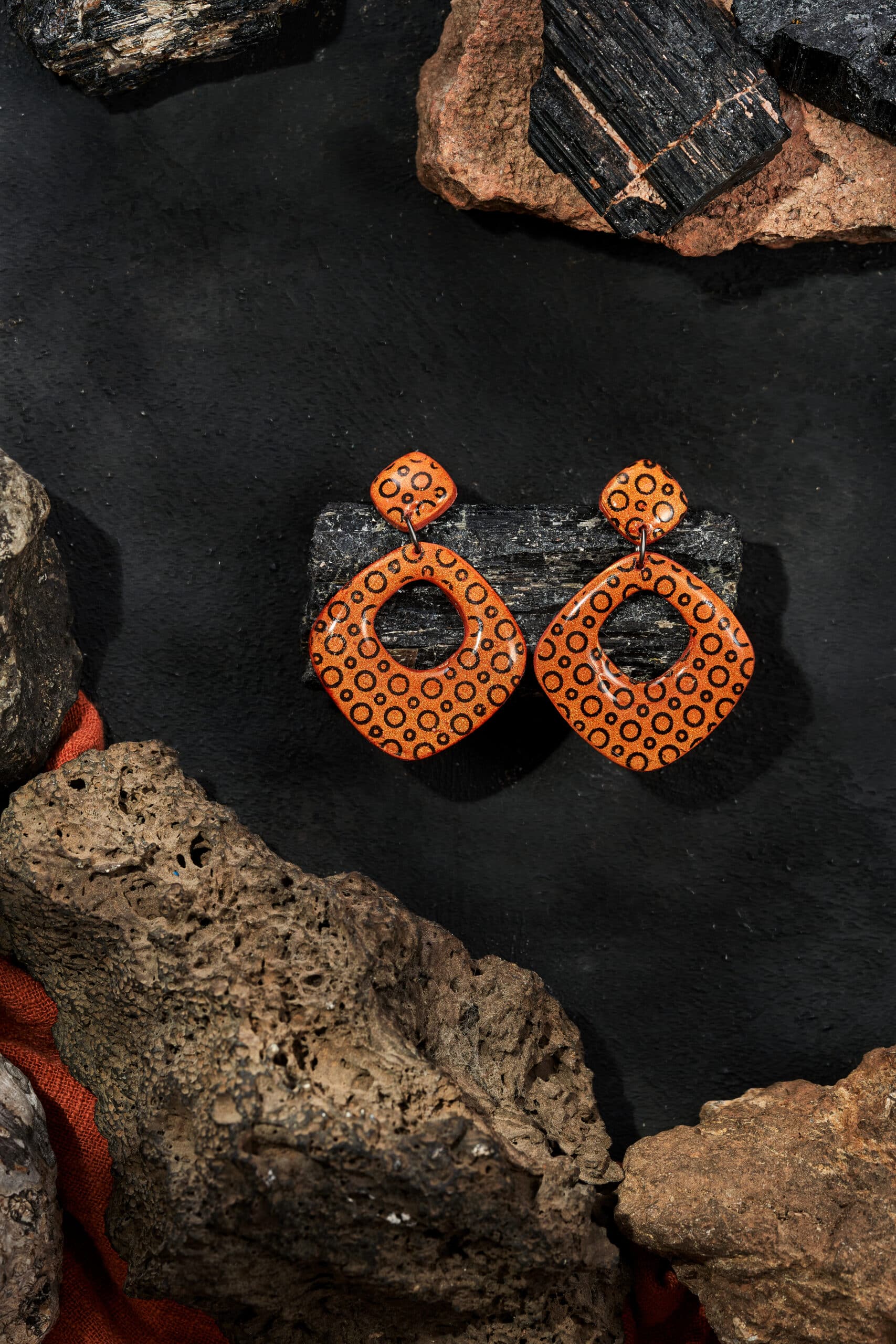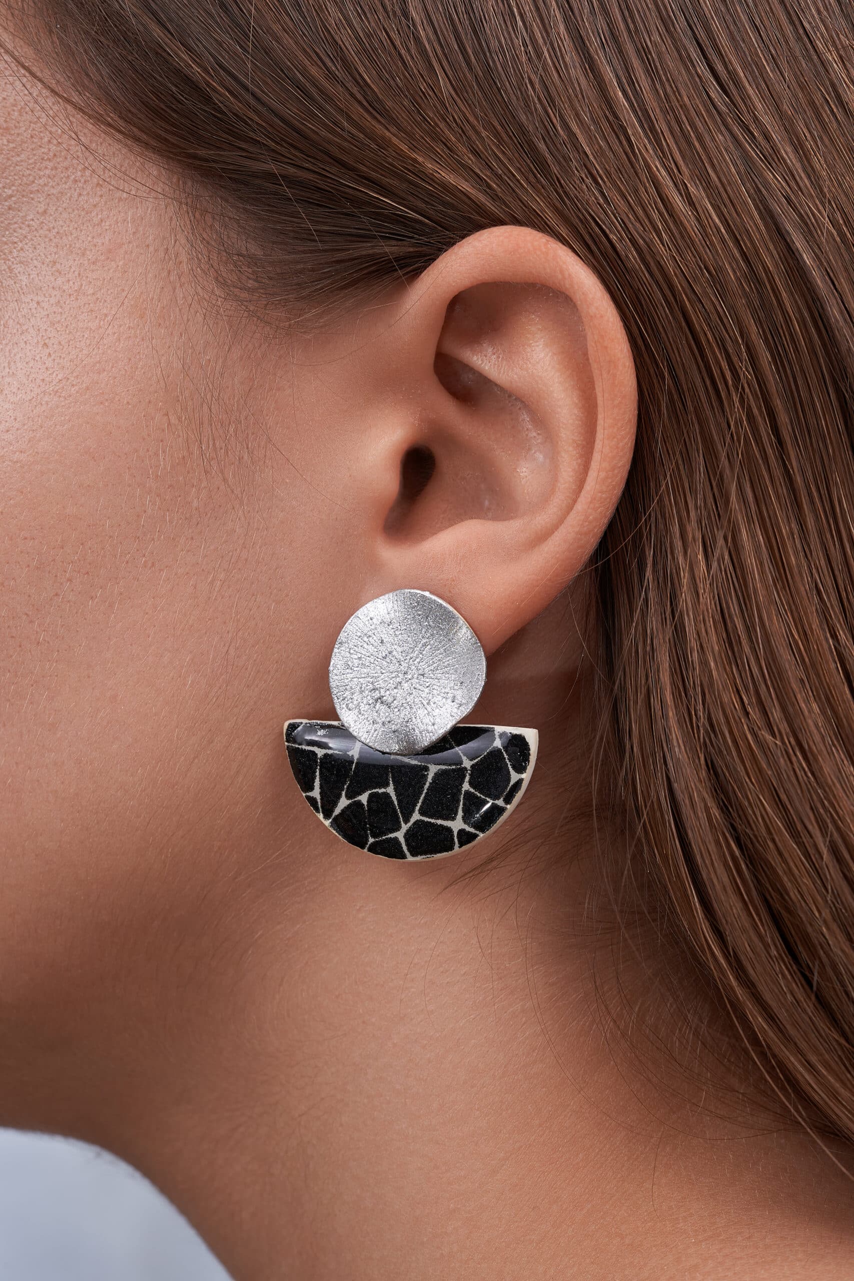 Pendientes de diseño moderno y elegante, compuestos por dos piezas: la parte inferior es una media luna blanca de arcilla polimérica decorada con formas abstractas negras similares a triángulos, aportando un toque artístico y contemporáneo. La pieza superior es un círculo de latón pintado en plateado que aporta brillo y contraste al conjunto. Ambas piezas están unidas, y el cierre está situado detrás del círculo superior, garantizando una sujeción cómoda y discreta.