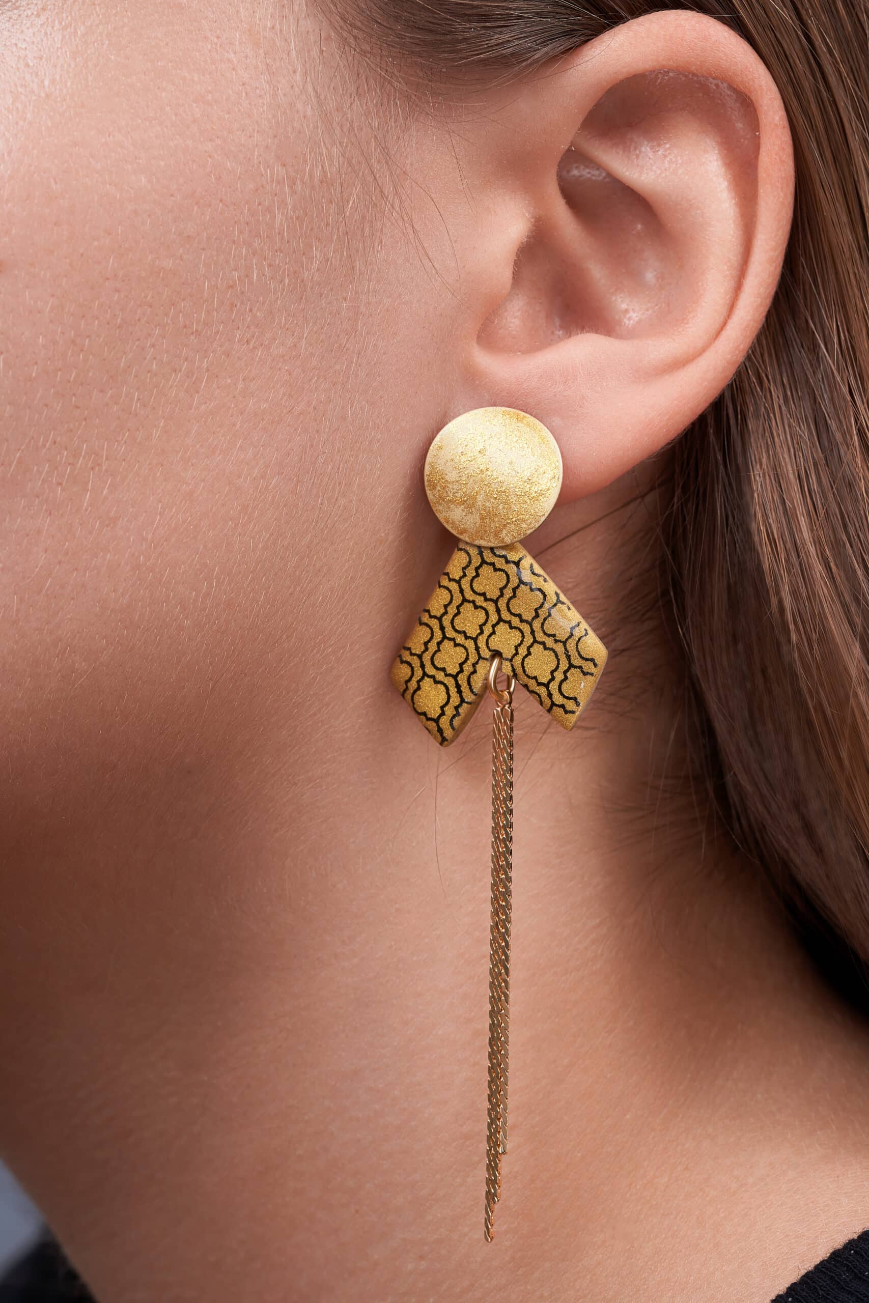 Pendientes de diseño original y llamativo, compuestos por tres piezas que forman una flecha invertida con un estilo elegante y contemporáneo. La parte superior es un círculo de latón bañado en oro de 14 quilates, decorado con purpurina en pintura dorada que aporta un toque de brillo sutil y sofisticado. En el centro cuelga la cabeza de la flecha, una pieza de arcilla polimérica en forma de punta orientada hacia arriba, decorada con un estampado floral en color negro que crea un contraste único con el dorado. La línea de la flecha se completa con una cadena de latón bañado en oro que cuelga desde la punta, añadiendo movimiento y ligereza al diseño. El cierre es de gancho, también de latón bañado en oro, que armoniza perfectamente con todo el conjunto.