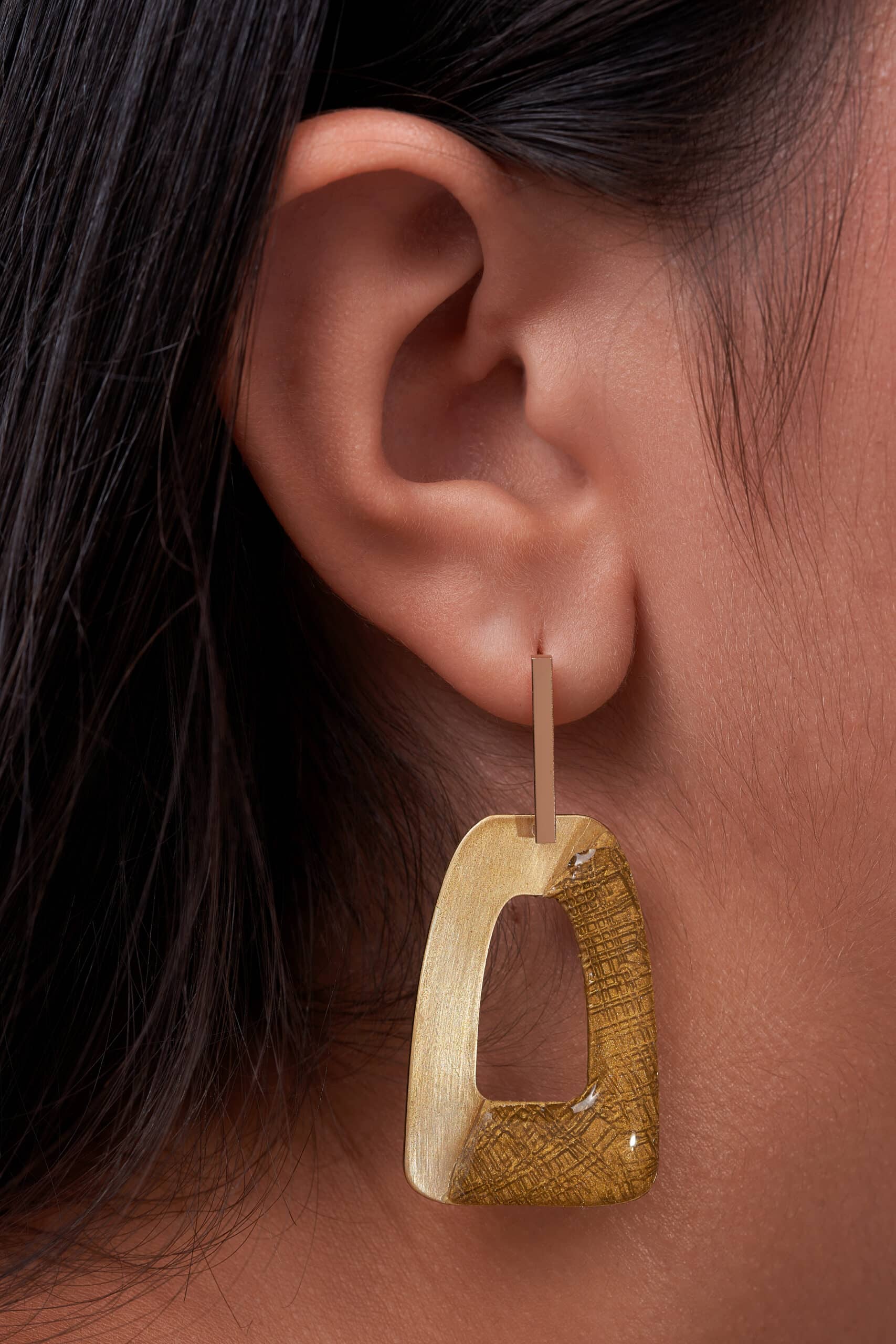 Pendientes de diseño geométrico minimalista que combinan la elegancia del latón pulido con la calidez de la arcilla polimérica en tono dorado-naranja. La pieza se divide en dos mitades: el lateral izquierdo es de latón pulido, mientras que el lateral derecho está trabajado en arcilla polimérica dorado-naranja, moldeada con relieves suaves y recubierta con una capa de resina transparente que aporta brillo, protección y un acabado vitrificado. Incorporan un cierre de pasador rectangular que realza su estilo moderno y versátil.
