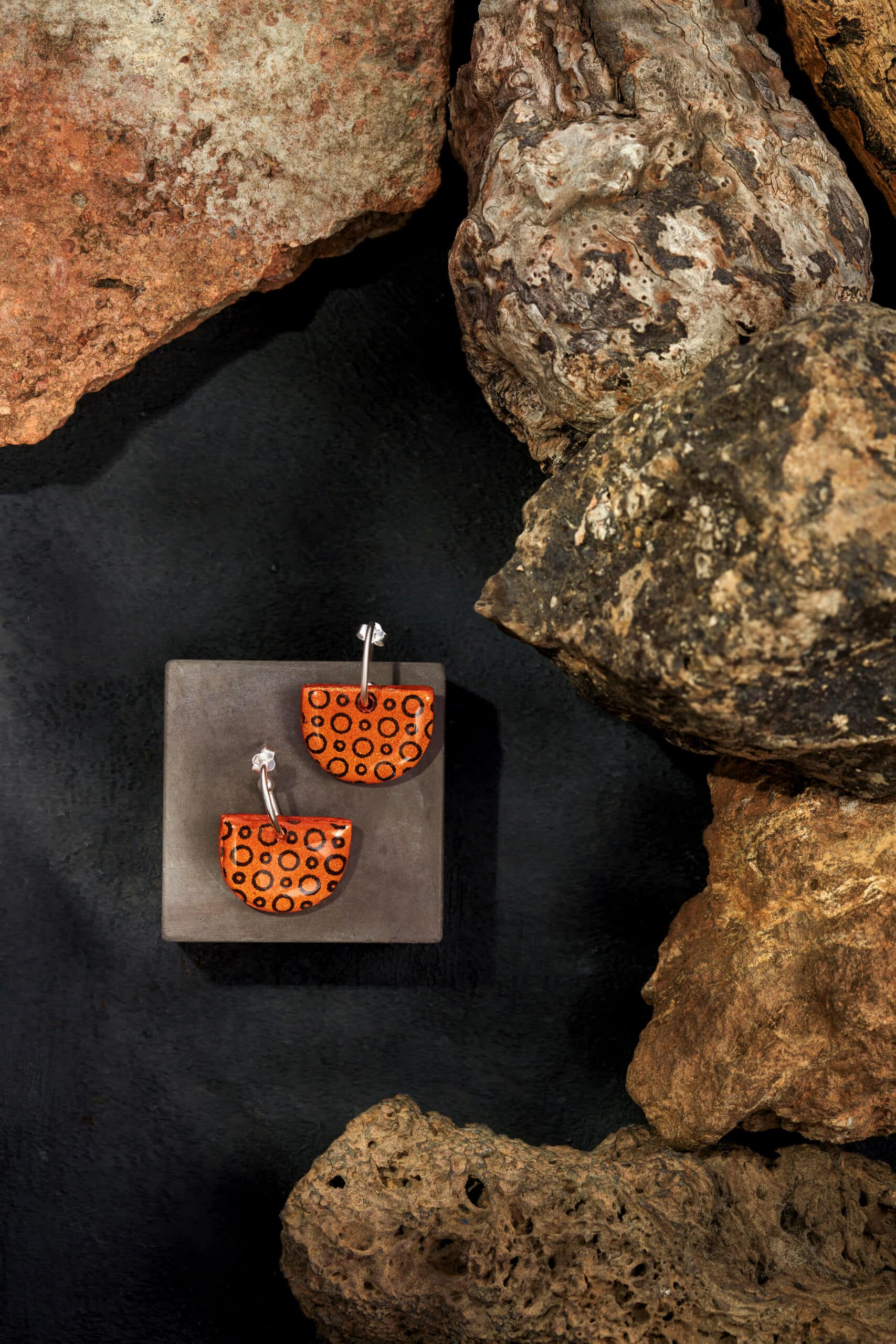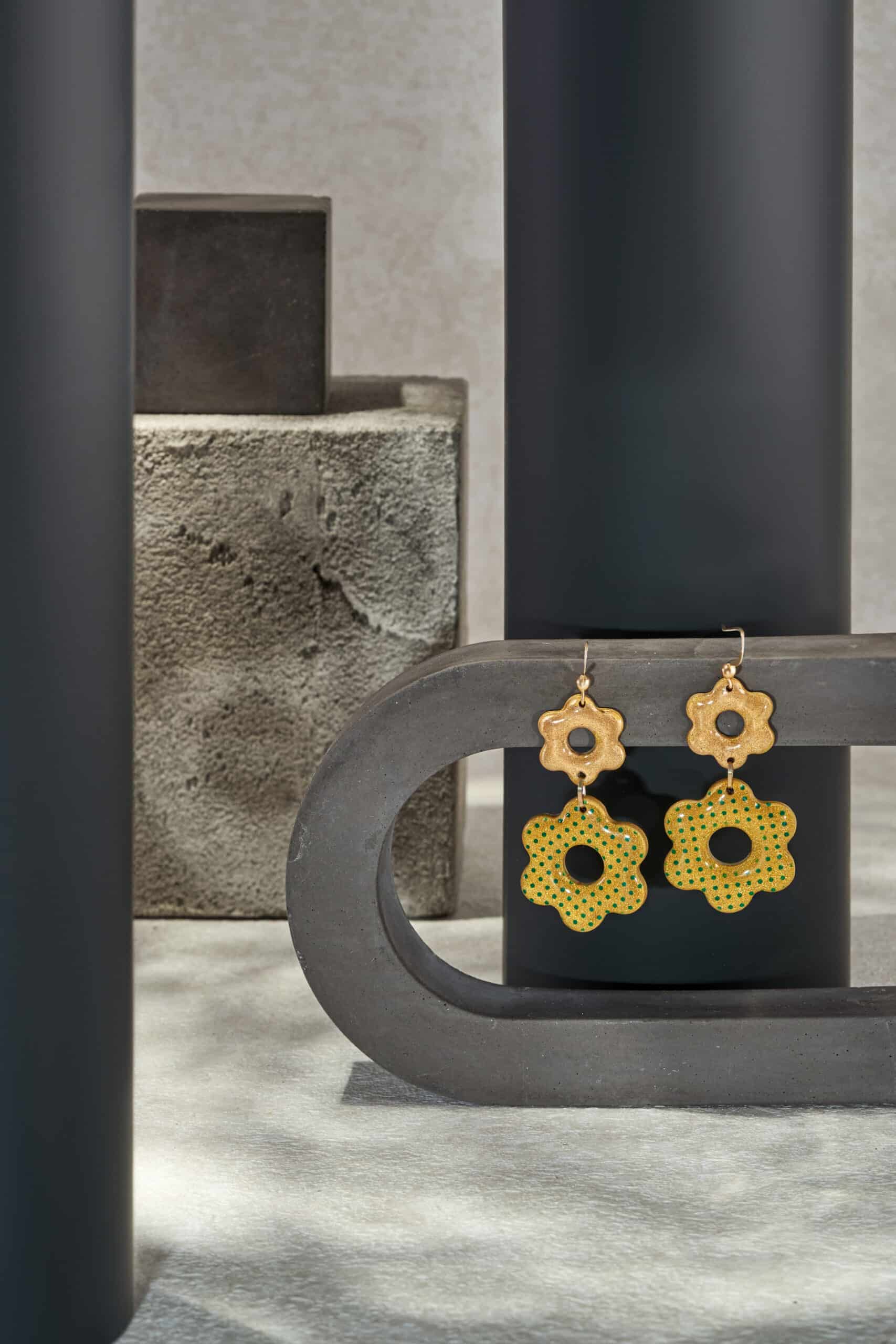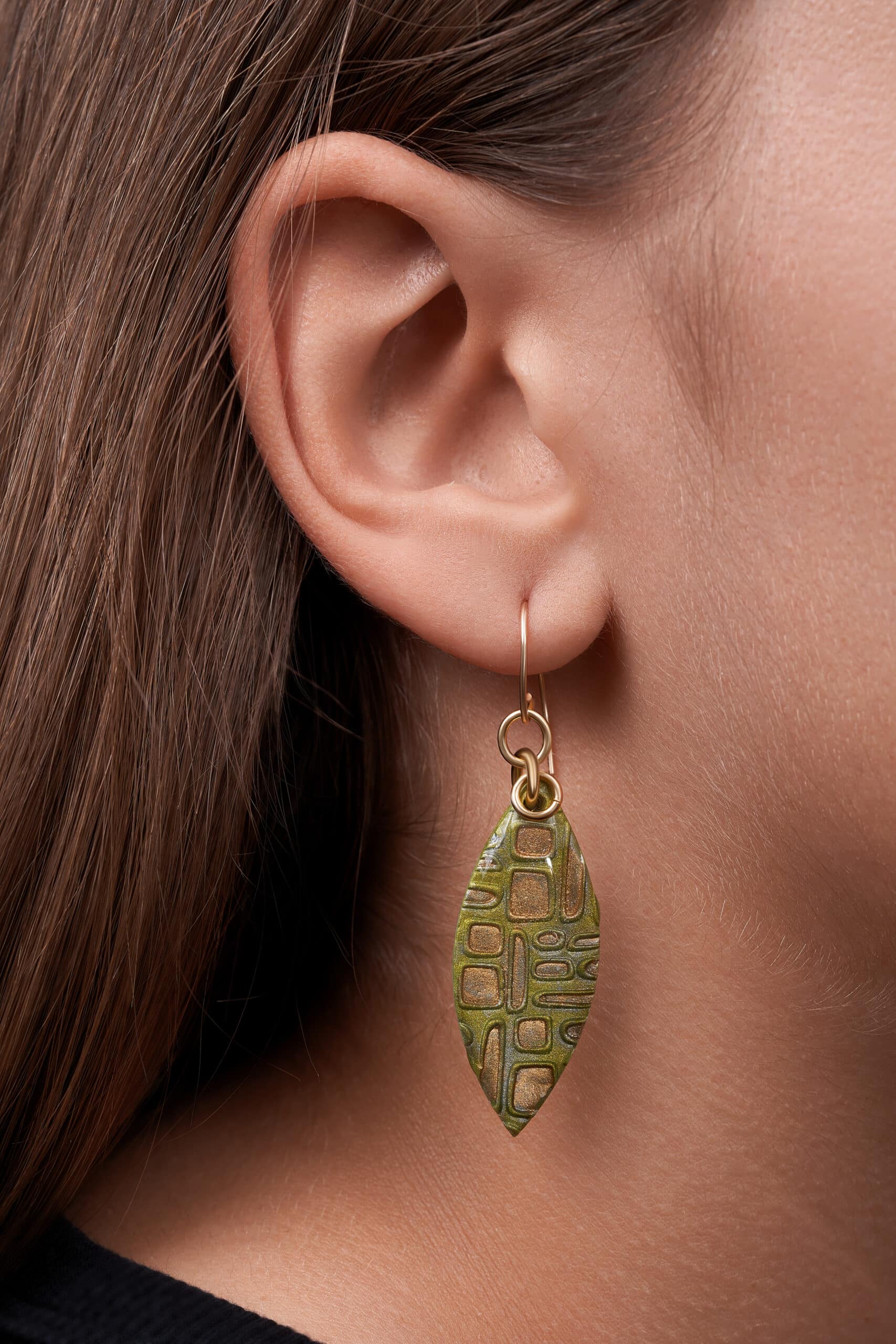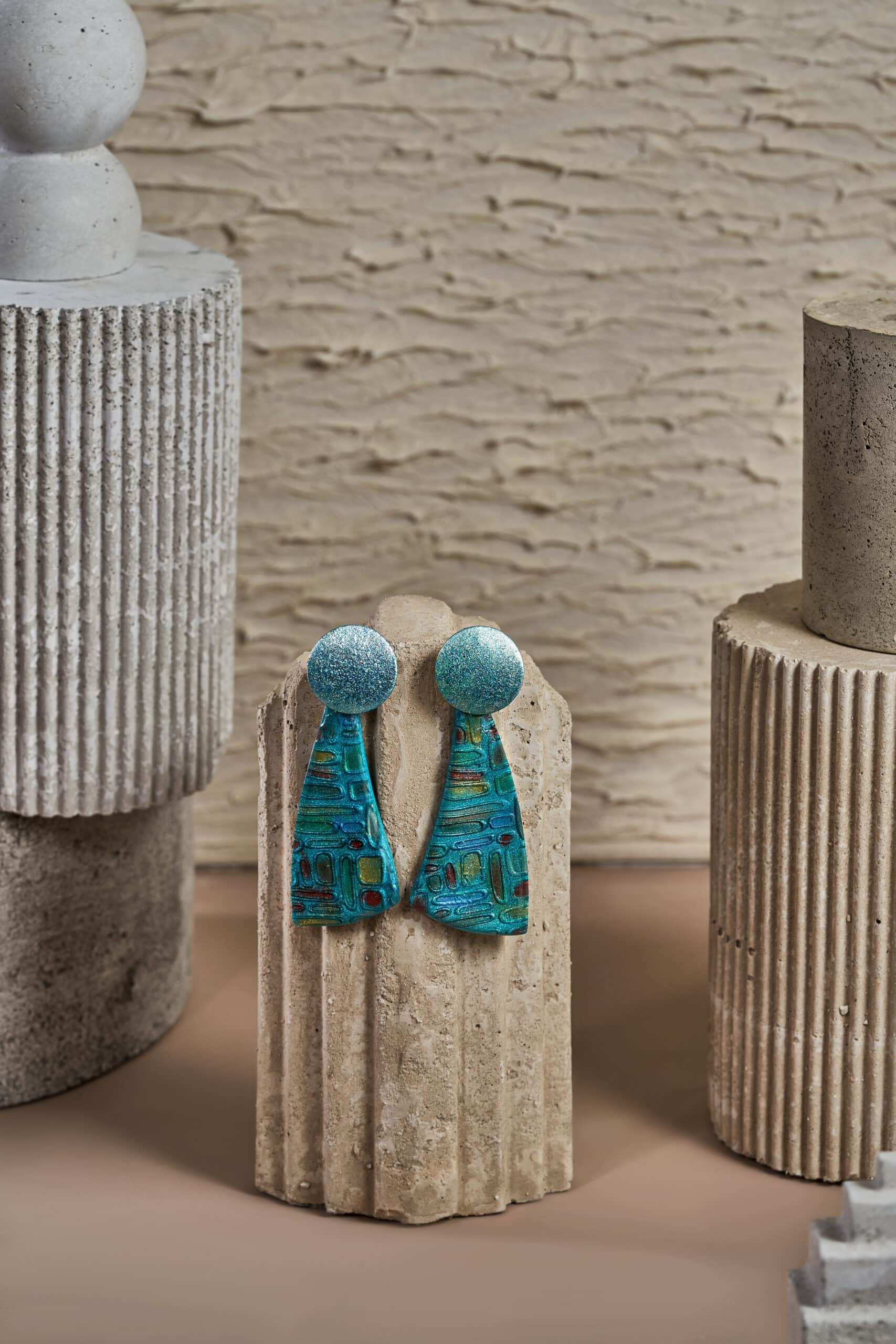 Pendientes de diseño geométrico minimalista, que combinan la frescura de la arcilla polimérica verde con la sofisticación de detalles geométricos en tonos dorados. La pieza presenta una base de arcilla pulida en color verde, decorada con formas geométricas como cuadrados y óvalos dorados que aportan un contraste elegante y moderno. Todo el conjunto está recubierto con una capa de resina transparente que realza el color, protege la superficie y proporciona un acabado vitrificado de alto brillo. El cierre de pasador rectangular completa su estilo contemporáneo.