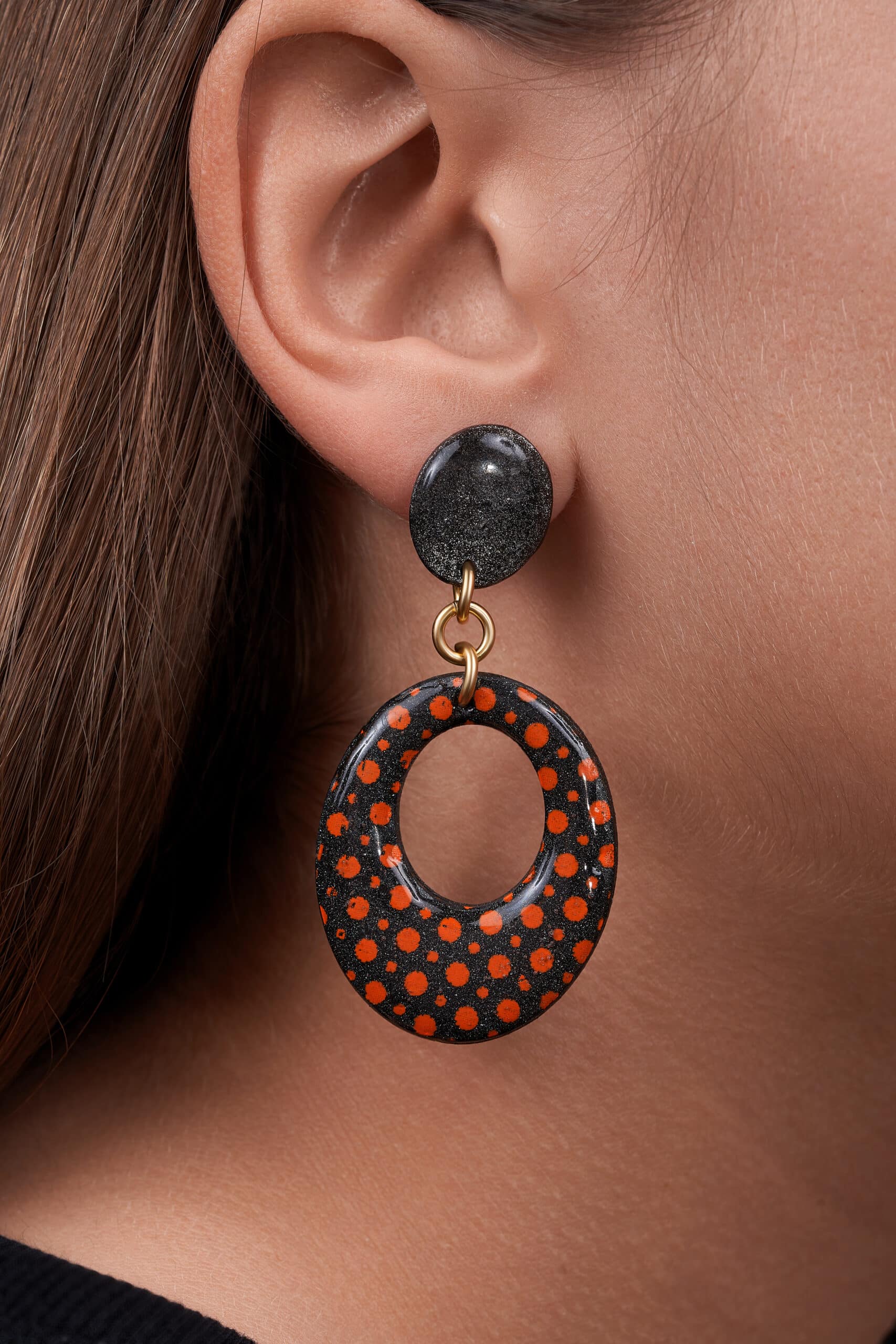 • Material: Arcilla polimérica negra y decorada con topos rojos, argolla y cierre de latón bañado en oro.