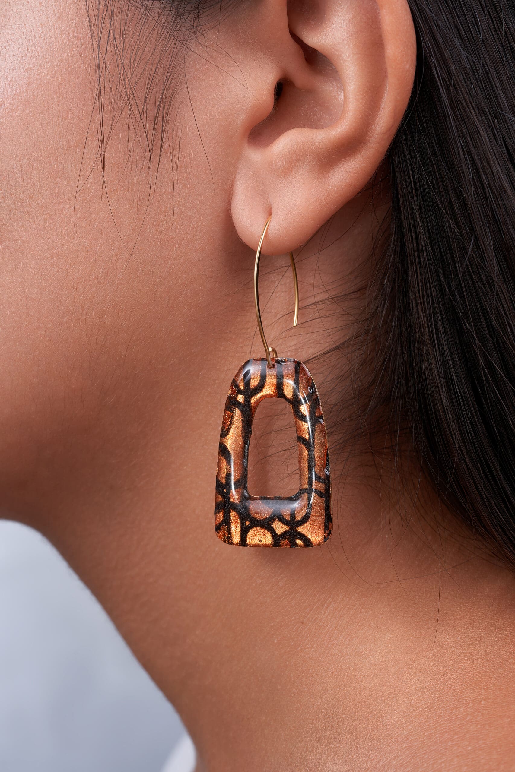 Pendientes de diseño moderno y llamativo, con forma de ventana rectangular que deja un hueco interior, aportando ligereza y un estilo original. Están elaborados en arcilla polimérica de color naranja oscuro, decorados con formas negras que combinan círculos y líneas, creando un estampado dinámico y contemporáneo. El gancho es un semicírculo de latón bañado en oro, que añade un toque cálido y elegante, completando el diseño con un cierre cómodo y seguro.