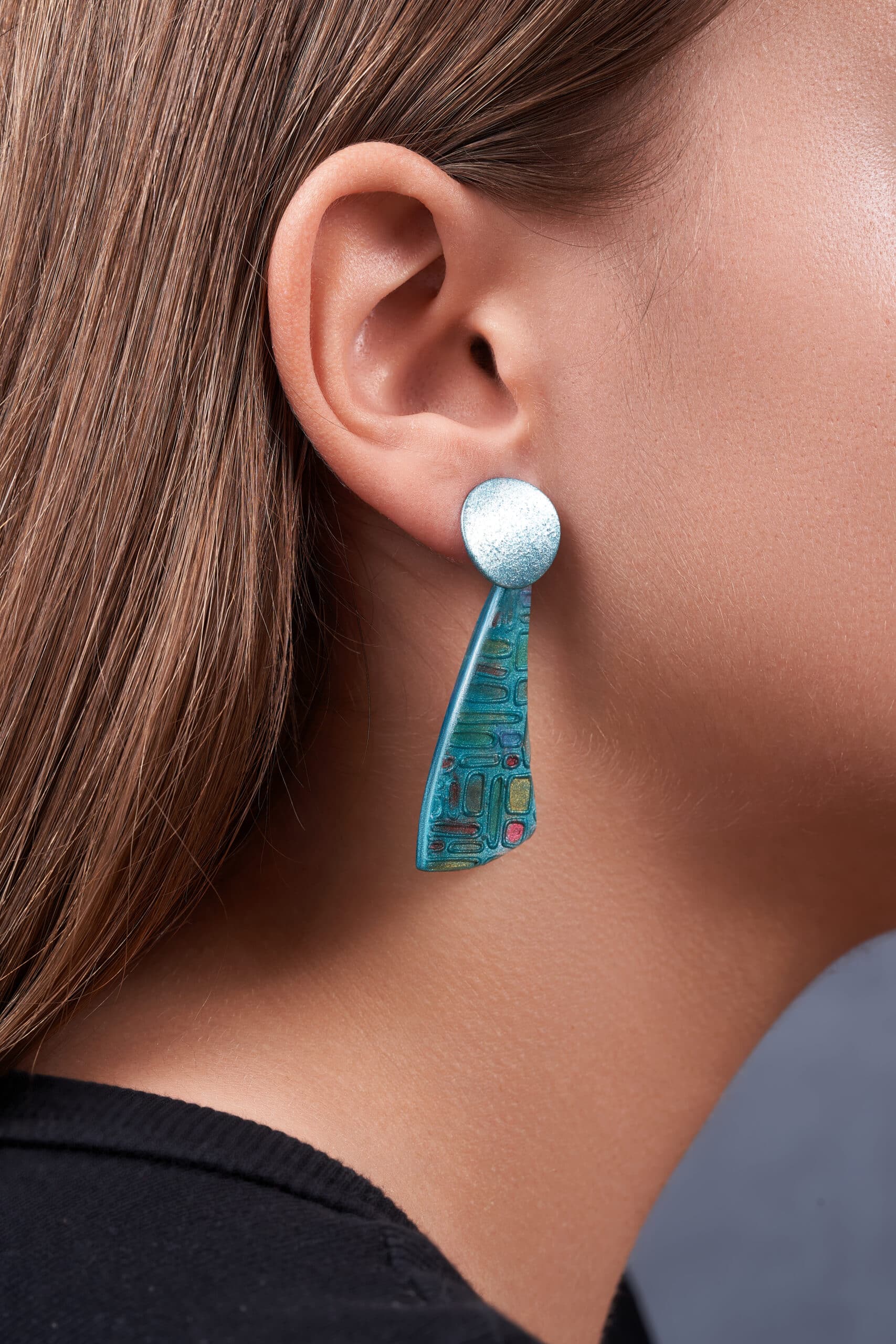 Pendientes de diseño abstracto compuestos por dos piezas de arcilla polimérica: una base circular con efecto glitter y una pieza colgante de forma trapezoidal invertida, ambas acabadas con resina epoxi de alto brillo que proporciona protección, durabilidad y un efecto cristal pulido. El diseño presenta una base en tonos turquesa con textura multicolor en relieve y destellos metálicos que aportan profundidad visual.